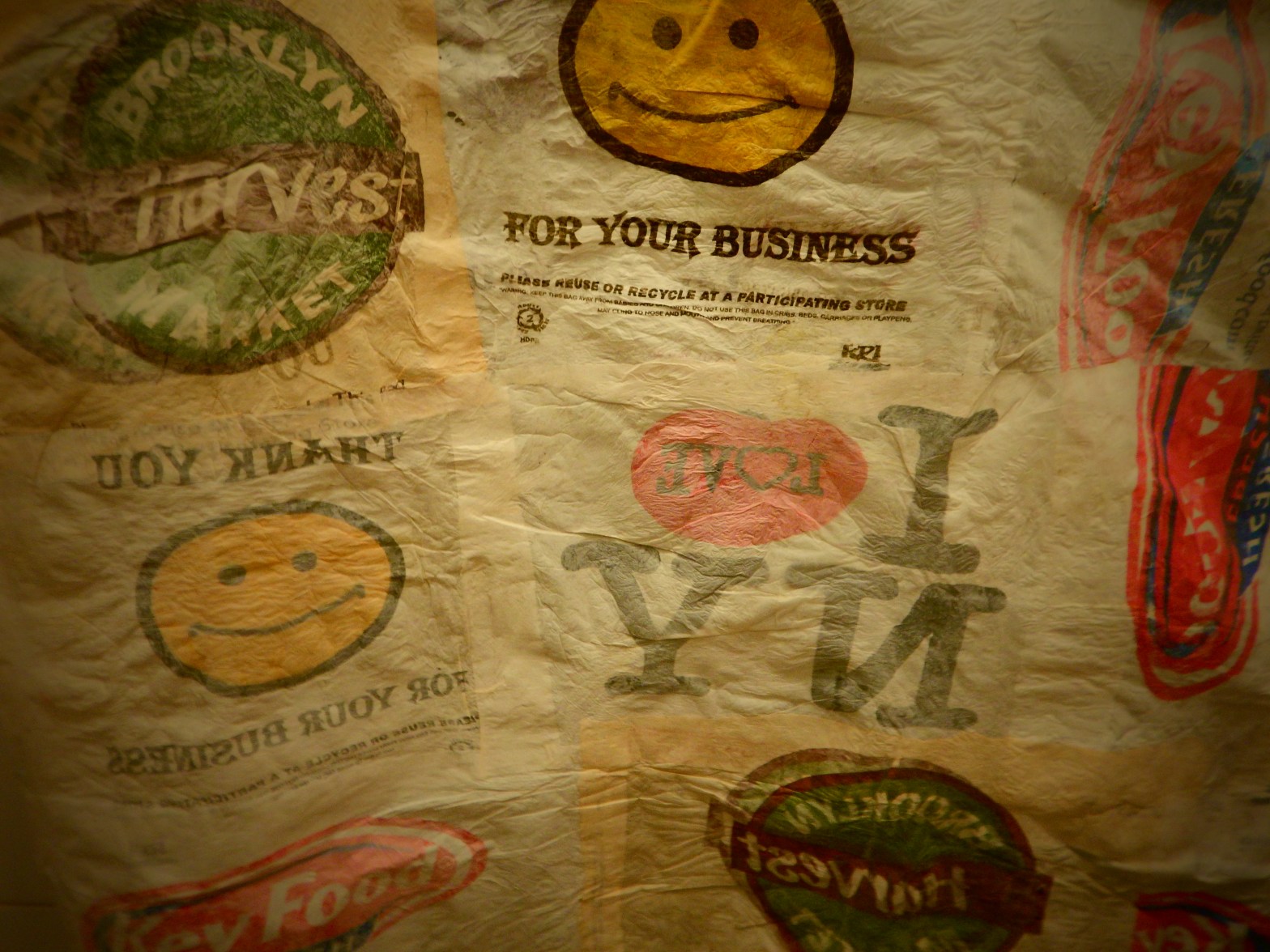 Shower curtain made out of plastic bags ironed together.Close up of fused-plastic grocery bag shower curtain.